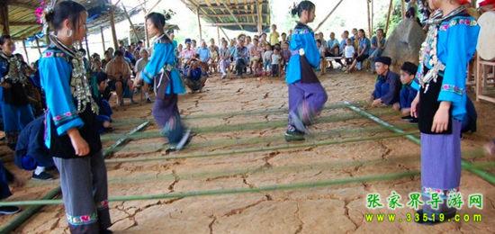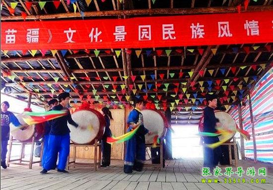 夢(mèng)幻苗疆進(jìn)寨必須經(jīng)過苗族人民接待遠(yuǎn)方賓客的歡迎儀式“攔門三卡” 唱攔門歌、喝攔門酒、敲苗家花鼓,通過后,方能進(jìn)寨。