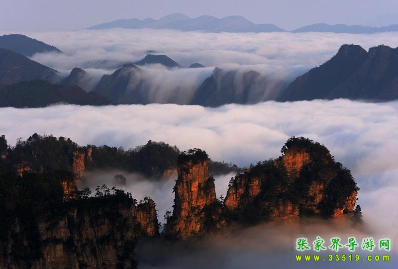 武陵源的春、夏、秋、冬,陰、晴、朝、暮,氣候萬(wàn)千。云霧是武陵源最多見的氣象奇觀,有云霧、云海、云濤、云瀑和云彩五種形態(tài)。雨后初霽,先是膘朧大霧,繼而化為白云,縹緲沉浮,群峰在無(wú)邊無(wú)際的云海中時(shí)隱時(shí)現(xiàn),如蓬萊仙島,玉宇瓊樓,置身其間,飄飄欲仙,有時(shí)云海漲過峰頂,然后以鋪天蓋地之勢(shì),飛滾直瀉,化為云瀑,蔚為壯觀。