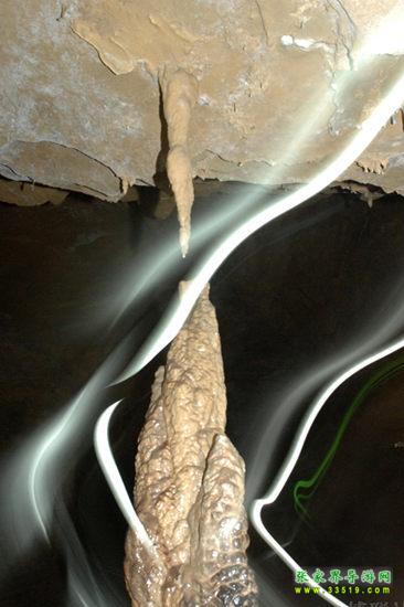 在這兒向您介紹一點(diǎn)溶洞學(xué)的知識。在溶洞中,自洞頂往下生長的叫石鐘乳,自洞底往上生長的叫石筍,兩者相向生長連在一起就叫石柱,三者統(tǒng)稱為鐘乳石。這兒有一根石鐘乳與一根石筍是相對生長的,差一點(diǎn)點(diǎn)就要連起來了,但他們卻永遠(yuǎn)不能合在一起,因?yàn)樯厦娴氖娙橐呀?jīng)沒有滴水,已經(jīng)失去了生命力。這好像一對苦苦守望的情人,近在咫尺,卻永遠(yuǎn)不能相逢。于是人們便給他們?nèi)×艘粋€(gè)非常動(dòng)人的名字——恨難逢。“盈盈一水間,脈脈不得語。”“天涯海角有窮時(shí),只有相思無盡處。”在無數(shù)個(gè)春去秋來的日子里,他們該有多少離愁別緒啊!——真不知道是石頭多情,還是人多情?——而有的人說得很樂觀,“兩情若是長久時(shí),又豈在朝朝暮暮”,所謂“距離產(chǎn)生美”嘛。