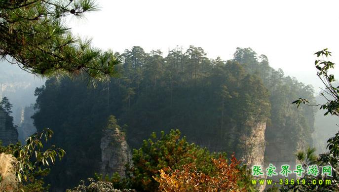 立黃石寨頂東北沿隔澗而望,對(duì)面一巖體臺(tái)地,高200余米,頂部面積約數(shù)百畝,四圍陡峭如削。其上長(zhǎng)滿(mǎn)黑黝黝的樹(shù)木,借助望遠(yuǎn)鏡,可看清有武陵松等,蒼翠蓊郁,猶如綠色迷宮。