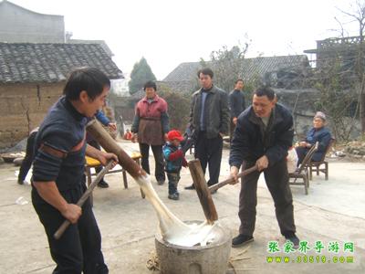 土家人民素有“二十八,打粑粑”的說法。每逢春節(jié)來臨,農歷臘月末,家家都要打糯米糍粑,所謂打糯米糍粑,據當地鄉(xiāng)土志書記載:“系糯米飯就石槽中杵如泥,壓成團形,形如滿月。大者直徑約尺5,尋常者約4寸許,3至8分厚不等。”打糯米糍粑是一項勞動強度較大的體力活,一般都是后生男子漢打,兩個人對站,先揉后打,即使冰雪天也要出一身汗。做粑粑也很講究,手粘蜂臘或茶油,先出砣,后用手或木板壓,要做得玉圓光滑,講究美觀。