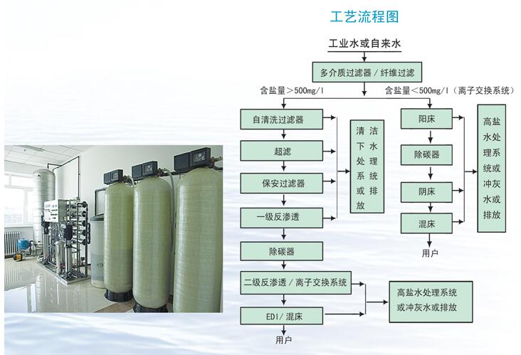 電力、冶金、石化、電子和煤化工生產需要大量除鹽水,以保證生產正常進行。根據水源水質不同,除鹽水處理系統(tǒng)采用不同處理工藝。除去水中陽離子和陰離子,使水中保持一定含鹽量。 本公司根據設計標準和規(guī)范和工程實踐,開發(fā)出適合不同水源水質和用途水處理工藝。如離子交樹脂處理工藝、全膜處理工藝、雙膜與離子交樹脂結合處理工藝等。本公司開發(fā)的工藝具有適應性強、操作簡單、投資少、耗水低優(yōu)點。