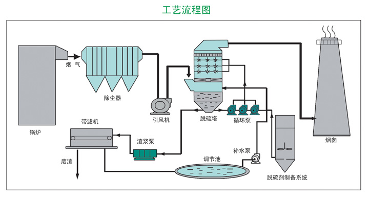 鍋爐煙氣由引風(fēng)機(jī)送入吸收塔預(yù)冷段,冷卻至適合的溫度后進(jìn)入吸收塔,往上與逆向流下的吸收漿液反應(yīng),氧化鎂法脫硫法脫去煙氣中的硫份。吸收塔頂部安裝有除霧器,用以除去凈煙氣中攜帶的細(xì)小霧滴。凈煙氣經(jīng)過除霧器降低煙氣中的水分后排入煙囪。粉塵與臟東西附著在除霧器上,會(huì)導(dǎo)致除霧器堵塞、系統(tǒng)壓損增大,需由除霧器沖洗水泵提供工業(yè)水對(duì)除霧器進(jìn)行噴霧清洗。