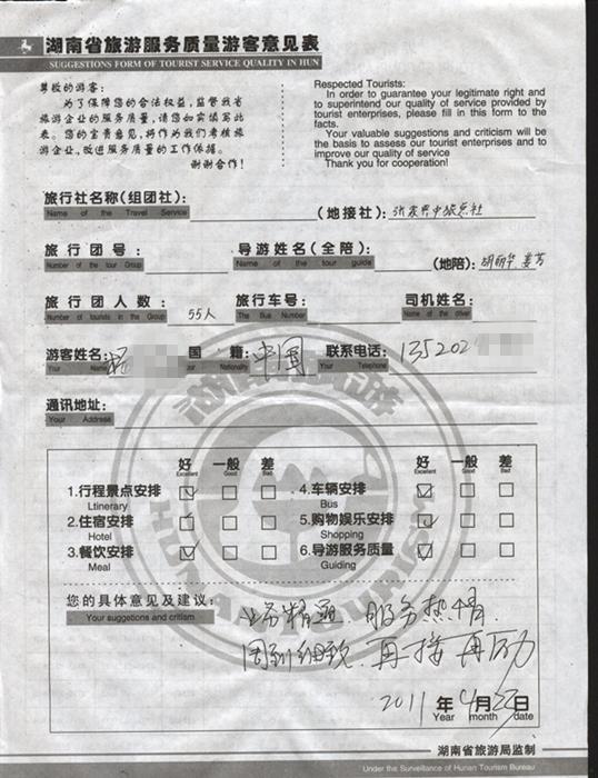 2011年4月23日楊先生一行55人旅游質(zhì)量反饋:業(yè)務(wù)精通,服務(wù)熱情,周到細(xì)致,再接再厲!