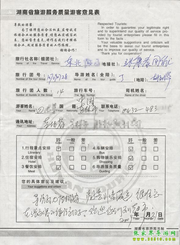 2009年7月28日吉林田先生一行14人接待質(zhì)量反饋單: