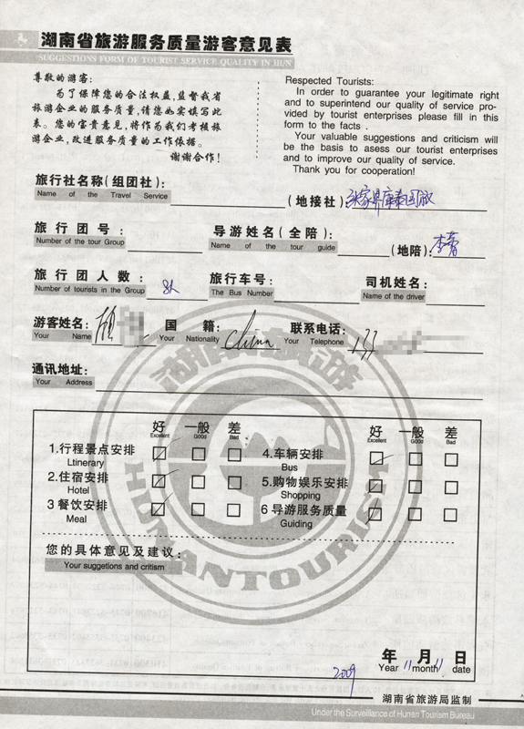 2009年11月11日顧先生一行8人旅游接待質(zhì)量反饋單:
