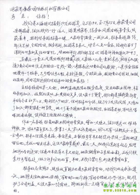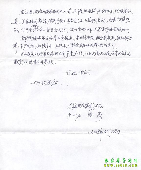 2009年5月19日“上?,F(xiàn)代攝影沙龍”一行16人,參加張家界旅游導游網(wǎng)組織的張家界旅游跟團,于2009年5月25日結(jié)束行程。游玩期間,由于導游楊蓓的出色講解和周到的服務(wù),得到客人的一致好評??腿颂丶谋頁P信一封,如下:
