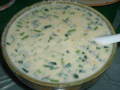 將用水浸泡過的黃豆用磨子磨碎,摻入切細(xì)的青菜葉,然后用溫火煮熟即可。此樣菜雖做法簡單,但營養(yǎng)價值極高且味鮮美,為當(dāng)?shù)厝顺S玫囊坏啦恕?/p>