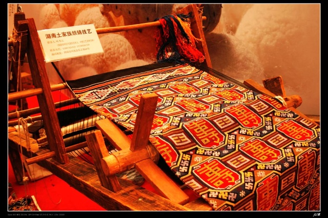 土家織錦的歷史悠久。早在漢代,它就初露頭角?!逗鬂h書.西南蠻夷傳》記載,“武陵蠻織績(jī)木皮,染以草,衣裳斑斕……”清同治年間編修的《永定縣志》也說(shuō):“土錦績(jī)五顏經(jīng)線為之,文彩斑斕可愛(ài),使用以為被,或作衣裙,或作巾,故又稱‘筒巾’。”